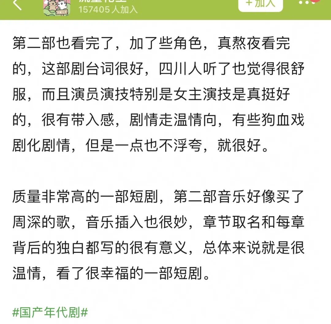 对于该剧的质感,也有网友细细品出了背后的匠心用心:“质量非常高的一部短剧,音乐插入也很妙,章节取名和每章背后的独白都写的很有意义,总体很温情,看了很幸福的一部短剧”;“没有套路,只有打拼的苦乐、家人共渡难关的温情,周深主题曲《时间啊》更添治愈感。用小家温情映照时代变迁,‘以家的暖抵御外界寒’的内核戳中人心,年度宝藏年代剧无疑”。