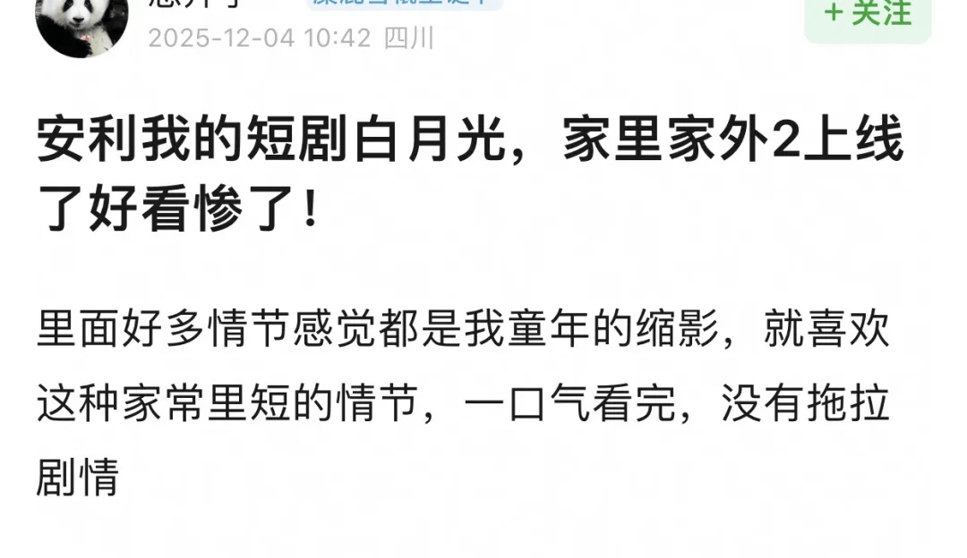 《家里家外》系列的推出开启短剧“系列化精品化”的创新探索,前作凭借优质内容积累高口碑,收获大量忠实观众,续作在此基础上实现内容与品质的双重升级,既延续了前作的温暖基调与核心设定,又拓展了新的叙事维度与现实议题,形成 “口碑积累 - 内容延伸 - 价值升级” 的创作闭环。